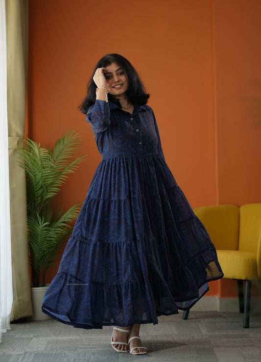 Sunburst Dark Blue Georgette Shirt Tier Dress