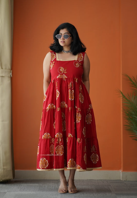 Hazelshine Tomato Red Cotton Tier Dress