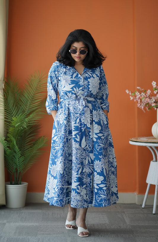 Hazelshine Blue Cotton Flared Shirt Dress