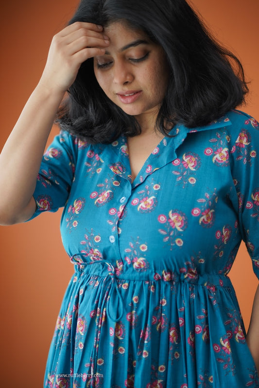 Hazelshine Teal Cotton Shirt Tier Dress